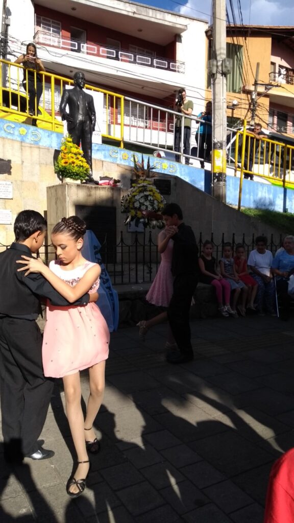 En pleno mes de junio, una pareja de adolescentes baila tango ante la estatua de Gardel en la calle 45 de Manrique. (odg)