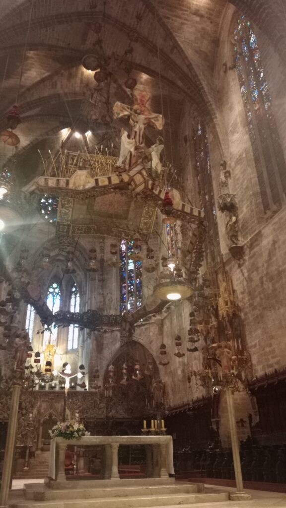 Comencemos con la Catedral de Santa María en Palma, el edificio más visitado. Semeja un gran barco atracado al borde de la bahía, teniendo de por medio unas murallas romanas y renacentistas. De estilo gótico levantino, posee el rosetón más grande del estilo gótico catedralicio europeo, con 13 metros de diámetro. Entre 1904 y 1914 el genial arquitecto Antonio Gaudí le realizó una serie de reformas, entre ellas ventanas y rosetones, un baldaquino o templete con cuatro columnas para el altar mayor, y decoración de cerámica del escudo de armas del obispado mallorquín. Es panteón de los reyes de Mallorca. También panteón funerario para cualquier ciudadano, a cambio de una donación en dinero.