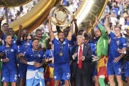 A Trump solo le faltó saltar con los jugadores de Chelsea para celebrar que son campeones del Mundial de Clubes. AP