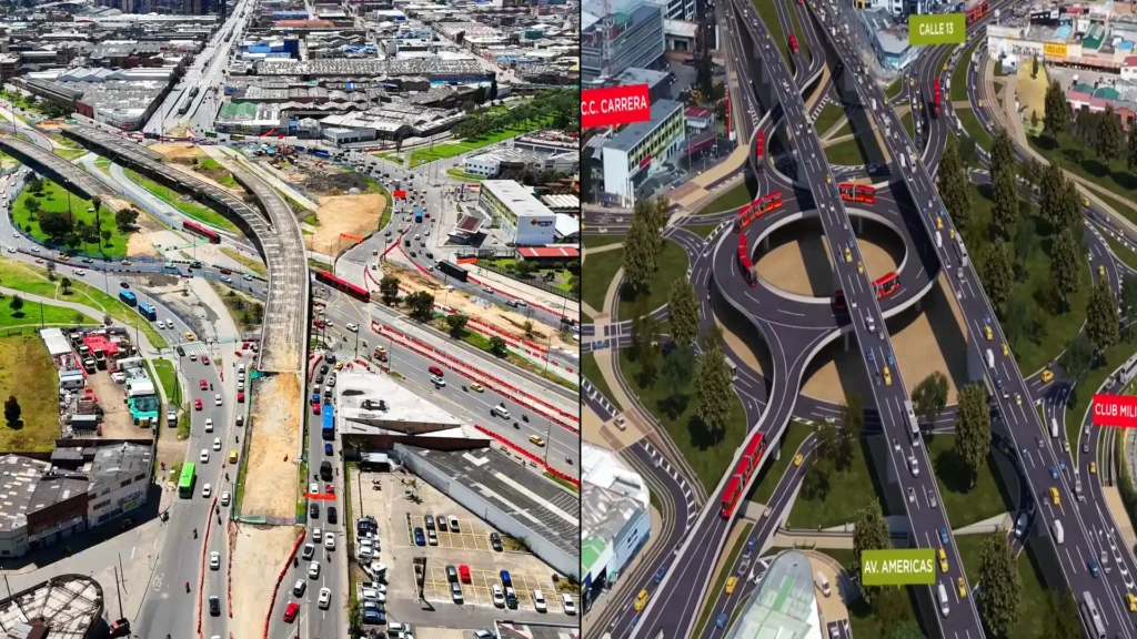 A la izquierda los puentes que serán derribados con implosión este 12 de octubre en Bogotá. A la derecha el proyecto vial que buscará agilizar el tráfico vehicular en la zona centro-occidental de la ciudad. Delta Arquitectura Digital.