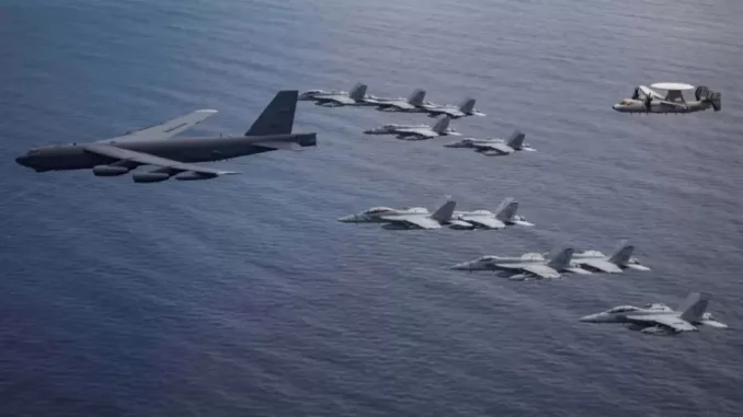 *Un bombardero B-52 acompañado de varios aviones de guerra FA-18 vuelan cerca de la costa de Venezuela.