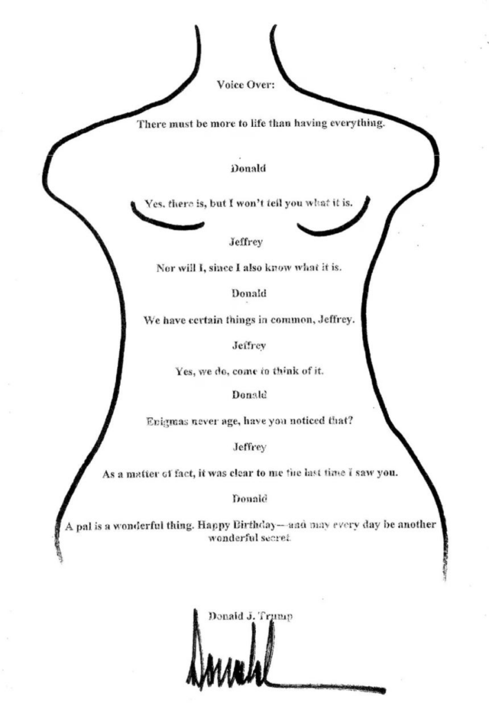 Tan solo un día después de la publicación del artículo, el abogado de Trump, Alejandro Brito, presentó una demanda en Florida alegando «daños económicos y a la reputación abrumadores para el presidente Trump, estimados en miles de millones de dólares» y afirmando que los periodistas Khadeeja Safdar y Joe Palazzolo «inventaron esta historia para difamar el carácter e integridad del presidente Trump y presentarlo de forma engañosa bajo una luz falsa». Dos meses después, el Comité de Supervisión de la Cámara de Representantes citó a declarar al autor del libro de cumpleaños recopilado por la cómplice de Epstein, Ghislaine Maxwell, con una imagen que coincidía exactamente con la descripción de los periodistas.