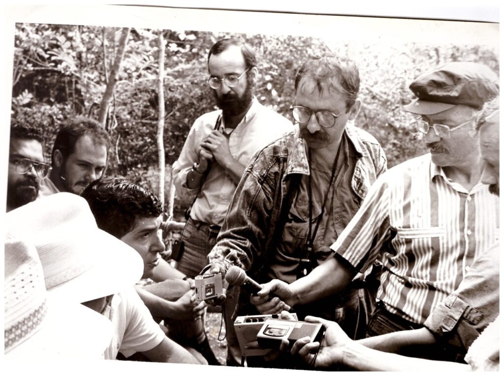 En la otra foto, tomada en las montañas del Tolima, Javier Darío Restrepo,  Rafael Galves (¿), a la sazón presidente del CPB y este servidor de tintos, entrevistamos a Carlos Pizarro, en presencia del Consejero de Paz, Rafael Pardo.